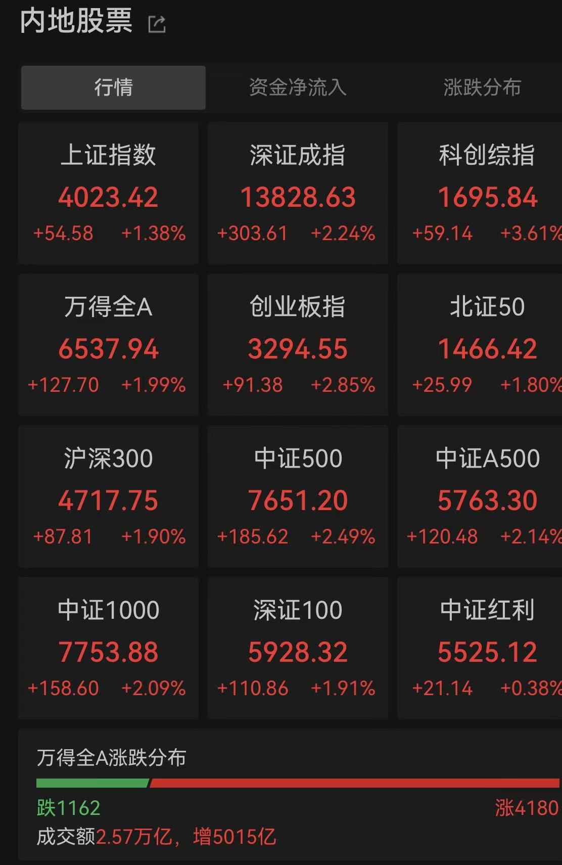 截至当日收盘,上证指数涨1.38%,报4023.42点;深证成指涨2.24%,报13828.63点;创业板指的涨幅接近2.9%,报3294.55点。科创50指数则大涨4.41%,北证50指数上涨1.8%。