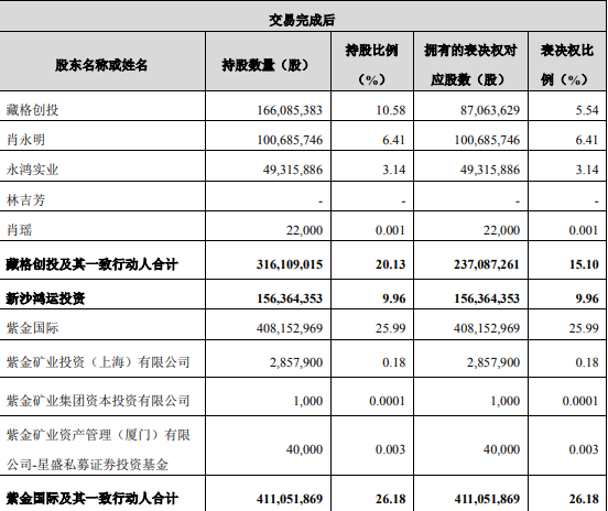 原实控人肖永明、藏格创业投资及其一致行动人,合计持有上市公司5.93亿股,股权转让完成后持股总数降至3.16亿股。由此估算,转让给紫金国际的部分股权金额达到97亿元左右。