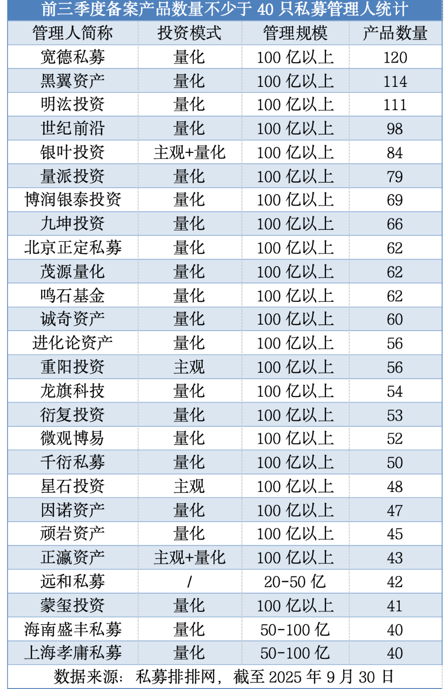 值得一提的是,备案产品数量增长的同时,百亿私募队列也在扩围。截至2025年9月底,百亿私募数量增至96家,较8月底的91家增加了5家。其中,正瀛资产、开思私募和太保致远(上海)私募为首次晋级“百亿俱乐部”。
