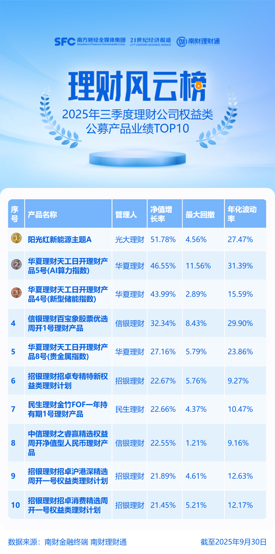 从单品业绩来看,三季度强行业属性产品收益领先,押注新能源、AI算力、新型储能的产品位列榜单收益前三,涨幅均超40%。榜单前三名产品三季度具体收益率看,阳光红新能源主题A、华夏理财天工日开理财产品5号(AI算力指数)、华夏理财天工日开理财产品4号(新型储能指数)净值增长率分别为51.78%、46.55%、43.99%。