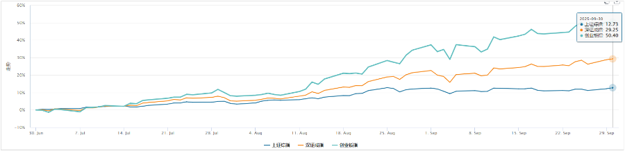 2025年第三季度,A股市场整体表现强劲。三季度以来(7月1日至9月30日,下同),指数持续震荡上攻,其中代表高成长高弹性的创业板指大涨超50%,上证指数、深证成指三季度累计上涨12.73%、29.25%,两指数双双创下自2019年4月以来的最高单季度涨幅。
