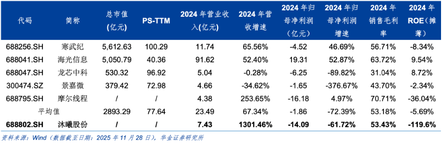 毛利率方面,2024年沐曦的毛利率超过了景嘉微、龙芯中科,但逊色于摩尔线程、海光信息、寒武纪。华金证券研究指出,沐曦的营收规模未及同业平均,销售毛利率则与同业均值相当。
