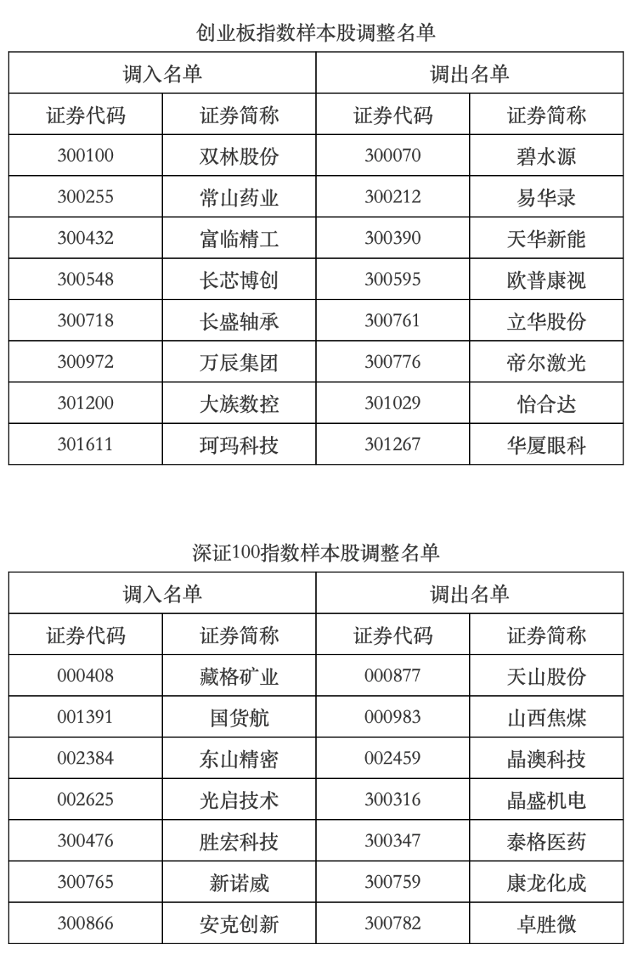 根据深圳证券交易所及深圳证券信息有限公司公告,深证成指更换17只样本股,创业板指更换8只样本股,深证100更换7只样本股,创业板50更换5只样本股。