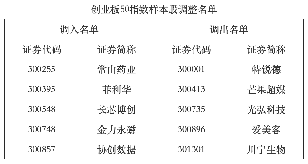 创业板50更换了5只样本股,调出了特锐德、芒果超媒等;调入长芯博创、协创数据等。