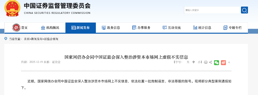 根据证监会12月19日官网,近期,国家网信办会同中国证监会深入整治涉资本市场网上虚假不实信息,对涉资本市场网上虚假不实信息进行系统性整治,依法处置一批炮制谣言、非法荐股的违规账号。此次行动直击资本市场信息乱象痛点,彰显监管部门对网络空间秩序的坚定维护。