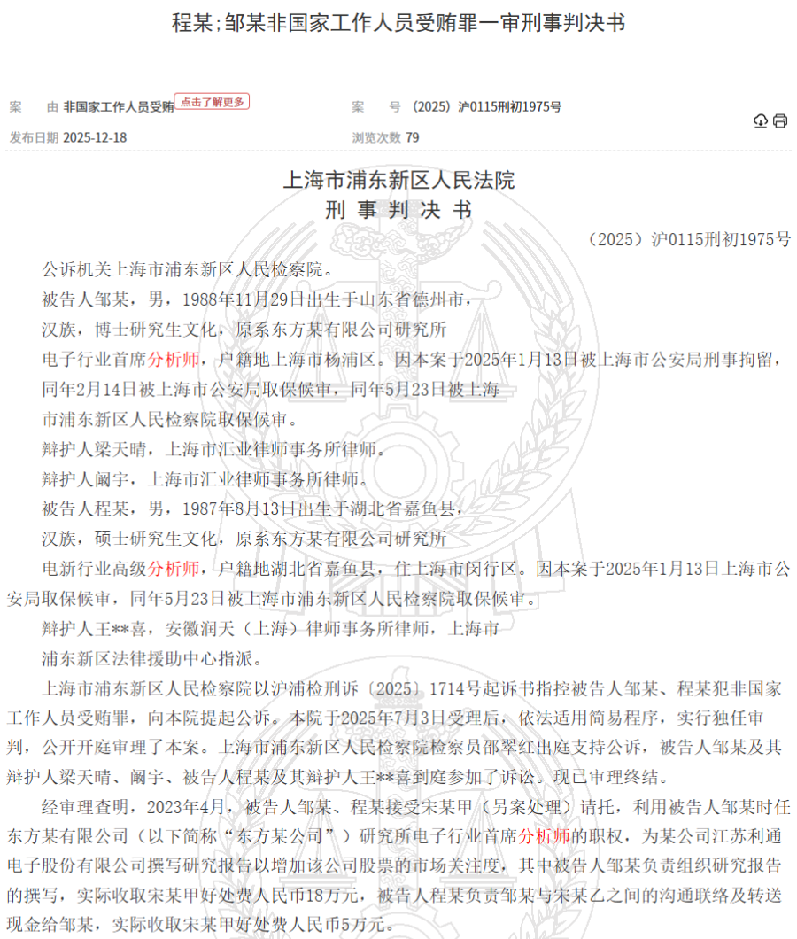 刑事判决书显示,被告人邹某,男,1988年出生,博士研究生文化,原系东方某有限公司研究所电子行业首席分析师,因本案于2025年1月13日被拘留;被告人程某,男,1987年出生,汉族,硕士研究生文化,原系东方某有限公司研究所电新行业高级分析师。不过,并未披露相关人员姓名。