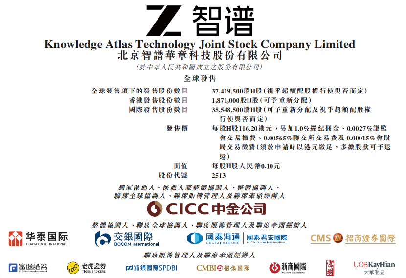 北京智谱华章科技股份有限公司(下称“智谱”)今起招股,预计2026年1月5日结束,并计划于2026年1月8日正式以“2513”为股票代码在港交所主板挂牌上市。
